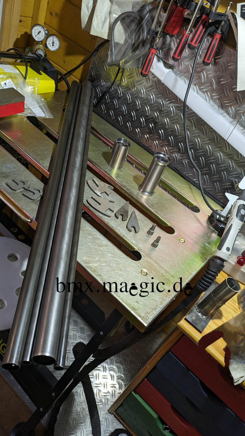 The picture below shows the raw material i use to build my BMX parts. I buy bottom bracket, head tube, drop outs and brake posts from a bike building parts supplier and raw chromoly tubes from the internet,